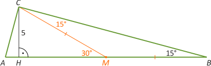 Zad. 1. Niech M będzie środkiem boku AB. Z własności środkowej przeciwprostokątnej wynika, że |CM| = |AB|/2 = |MB|, skąd trójkąt CMB jest równoramienny, a kąt zewnętrzny AMC ma miarę 30°. W trójkącie ekierkowym CHM mamy |CM|=10, zatem |AB| = 20 i PABC = 50.