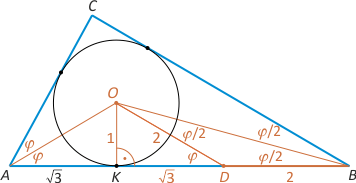 Zad. 2. Na boku AB obierzmy punkt D taki, że |KD| = √3. Zauważmy, że trójkąt ADO jest równoramienny i niech |∡ADO| = φ. Jest to jednocześnie kąt zewnętrzny trójkąta ODB, w którym |∡DBO| = φ/2 (bo OB jest dwusieczną). Oznacza to, że |∡DOB| = φ/2 i |OD| = |DB| = 2, zatem trójkąt OKD jest ekierkowy i φ = 30°. Ostatecznie szukane kąty mają miary 30°, 60° i 90°.