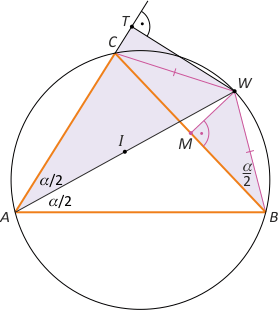 Zad. 3. Niech |AB|>|BC|>|AC| i 2|BC|=|AB|+|AC|. Oznaczmy przez I środek okręgu wpisanego w trójkąt, a przez M środek boku BC. Trójkąt, którego długości boków tworzą ciąg arytmetyczny, nazywany bywa trójkątem różnicowym. Zachodzi wówczas fakt, że środek I dzieli odcinek AW na połowy. Z twierdzenia Ptolemeusza (o bokach i przekątnych czworokąta wpisanego w okrąg) mamy |AW|·|BC| = |AB|·|CW| + |AC|·|WB|. Z własności trójliścia (patrz zad. 3 z lutego 2014) mamy |CW|=|WB|=|IW|. Podstawiając do wcześniejszej równości, otrzymujemy |AW|·|BC| = (|AB|+|AC|)·|IW| i dalej (wobec założenia) |AW|·|BC| = 2|BC|·|IW|, skąd otrzymujemy |IW| = |AW|/2. Zauważmy teraz podobieństwo trójkątów AWT i WMB (oba są prostokątne z kątem ostrym α/2). Otrzymujemy proporcję |AT|:|AW| = |MB|:|WB| = (|BC|/2):|IW| = (|BC|/2):(|AW|/2), skąd |AT| = |BC|.