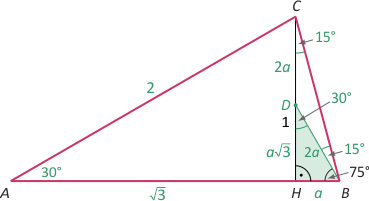 Zad. 4. Niech D będzie takim punktem, że trójkąt CDB jest równoramienny. Wówczas trójkąt HBD jest ekierkowy. Oznaczmy |HB|=a. Wówczas |HD|=a√3 i |BD|=|DC|=2a. Dalej |CH|=1=2a+a√3, skąd a = 2–√3. Zatem |AH|=|AB|–|HB|=√3. Z twierdzenia Pitagorasa w trójkącie AHC otrzymujemy |AC|=2, a zatem trójkąt AHC jest ekierkowy i szukany kąt ma miarę 30°.