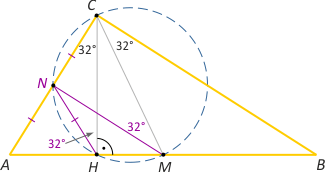 Zad. 1. W trójkącie ABC kąty ACH i MCB mają miarę po 32°. Oblicz miarę kąta HCM, gdzie H jest spodkiem wysokości opuszczonej z wierzchołka C, a M jest środkiem boku AB.