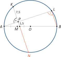 Zad. 3. Dany jest okrąg o środku O. Z punktu A na tym okręgu poprowadzono średnicę AB i cięciwę AL. Niech M oznacza środek odcinka AO. Na okręgu obrano punkt K taki, że odcinki KM i AL są prostopadłe i przecinają się w punkcie P. Wiedząc, że |KP| = 7,5 oraz |PM| = 1,5, oblicz promień okręgu.