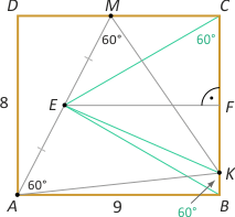 Zad. 4. (wolna amerykanka) W prostokąt ABCD, w którym |AB|=9 i |AD|=8 wpisano trójkąt równoboczny AKM. Oblicz długość linii średniej trapezu ABCM.