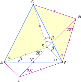 |CK|=|CN| oraz |AK|=|BN|. Trójkąt CKN jest równoramienny i podobny do trójkąta ABC, bo mają ten sam kąt przy wierzchołku C. Zatem |∡CKN| = α +β. Przedłużmy środkową KM do punktu L takiego, że |ML|=|KM|. Otrzymujemy równoległobok ALBK, w którym |∡KLB|=28°. Zauważmy, że trójkąty LBK i KBN są przystające (na mocy cechy bkb). Stąd |∡KNB|=28°. Ostatecznie |∡CKB| = α+β+180°–(28°+α+β) = 152°.