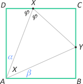 |AX|:sin(2α+β) = |AY|:sin(90°–α), a po podstawieniu za AX i AY równość przyjmuje postać a:sin(2α+β)cosα = a:cosα·cosβ. Stąd otrzymujemy sin(2α+β) = cosβ = sin(90°–β). Ostatecznie 2α+β = 90°–β, czyli α+β = 45°, zatem szukany kąt X ma miarę 45°.