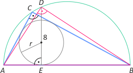 Zad. 1. W półokrąg o średnicy AB wpisano nierównoramienny trójkąt ABC. W trójkąt ten wpisano okrąg styczny do AB w punkcie E. Na półokręgu obrano punkt D taki, że odcinek ED jest prostopadły do AB. Wiedząc, że |DE|= 8, oblicz pole trójkąta ABC.