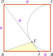 Zad. 2. Dany jest kwadrat ABCD. Z wierzchołka D poprowadzono styczną w punkcie E do okręgu o średnicy BC przecinającą bok AB w punkcie F. Wiedząc, że pole trójkąta AFE wynosi 30, oblicz pole trójkąta ABC.