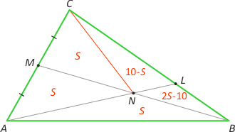 Zad. 3. Wprowadźmy oznaczenia jak na rysynku niżej. Wówczas SABC = 3S+(10–S)+(2S–10) = 4S. Dalej mamy |BL|/|LC| = (3S–10)/(S+10) = (2S–10)/(10–S), skąd S=6 i SABC = 24.