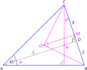 Zad. 4. (wolna amerykanka) Niech O będzie środkiem okręgu opisanego na trójkącie ABC. Wówczas |∡BOC|=90°, bo jest kątem środkowym opartym na łuku BC. OM jest środkową w trójkącie prostokątnym, więc |OM|=|BC|/2 = 5/2. Z kolei (*) |AH| = 2·|OM| = 5. Z podobieństwa trójkątów HDC i ABD mamy |HD|/3 = 2/(5+|HD|), skąd |HD|=1. Ostatecznie SABC = 6·5/2 = 15. Fakt oznaczony (*) łatwo wykazać na mocy podobieństwa trójkątów ABH i OMN w skali