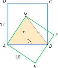 Zad. 1. Dane są kwadraty ABCD i AEFG o wspólnym wierzchołku A i bokach długości odpowiednio 12 i 10. Wierzchołek B leży na boku EF. Oblicz odległość wierzchołka G od boku AB.