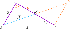 Zad. 2. W trójkącie ABC zachodzi |AB|=4, |AC|=2, |AM|=√7 (gdzie M jest środkiem boku BC). Znajdź miarę kąta B.