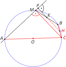 Zad. 3. Na łuku AB pewnego okręgu obrano dowolny punkt M. Niech K będzie środkiem odcinka MB, a P - jego rzutem prostokątnym na prostą AM. Wykaż, że wszystkie proste PK przecinają się w jednym punkcie.