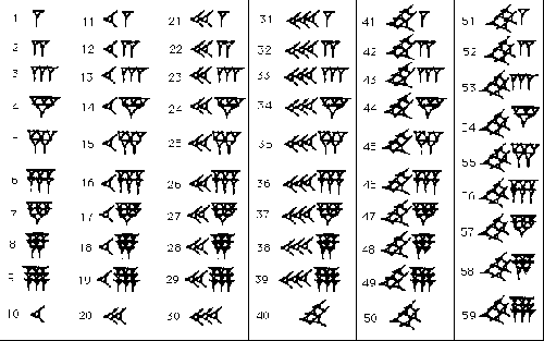 b) zapis babiloński - pozycyjny z bazą 60, używano w nim 2 cyfr oznaczających 1 i 10 oraz odstępu zamiast zera pozycyjnego.
