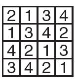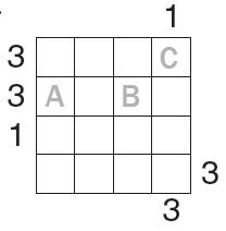 Zad. 2. Na planie osiedla ustaw wieżowce o wysokościach od 1 do 4, tak aby w każdym rzędzie i kolumnie wszystkie wieżowce miały inne wysokości. Liczby na zewnątrz tabeli wskazują, ile wieżowców widać z miejsca, w którym dana liczba stoi (wieżowce wyższe zasłaniają niższe). W odpowiedzi podaj kolejno liczby stojące w polach oznaczonych A, B, C.
