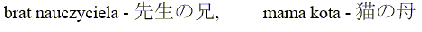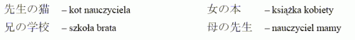 Zad. 2. Porównując wyrażenia "kot nauczyciela" i "nauczyciel mamy" oraz pozostałe, widzimy, że zapisują się one w japońskim według schematu: wyraz określający ("posiadacz") + znak